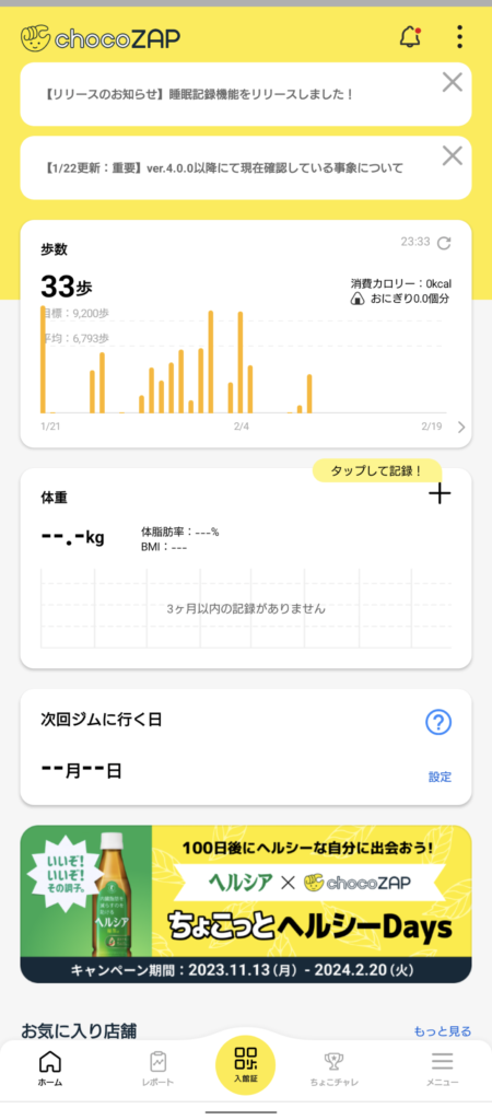 店内入店がQRコード読み取りで管理されているので来店日が確認出来たり、初回特典の体組成計、スマートウォッチを使って貰おうと自社開発でアプリを連携出来るようにしていることから、 chocoZAPはITに力を入れているのが実感できます。