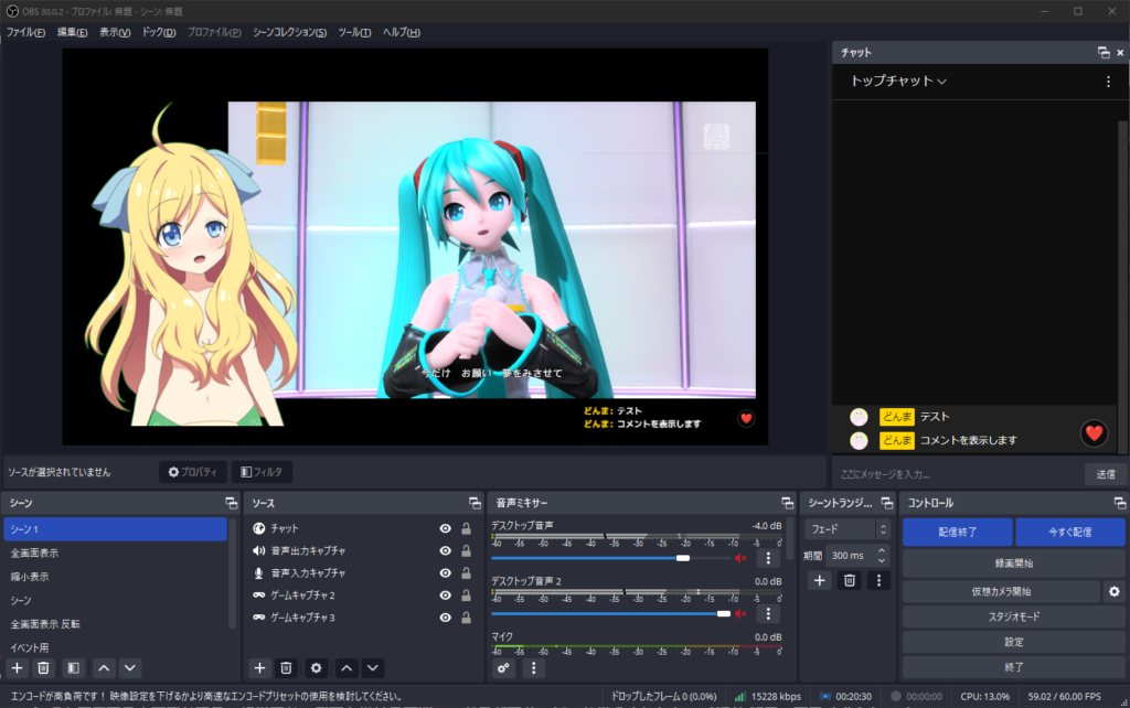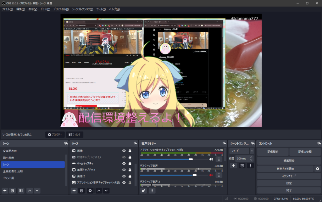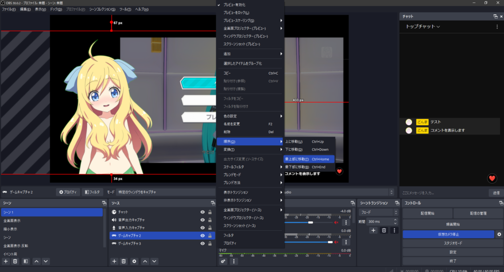 画像や文字が重ねて表示出来ます。配信画面に近づいてきましたね!