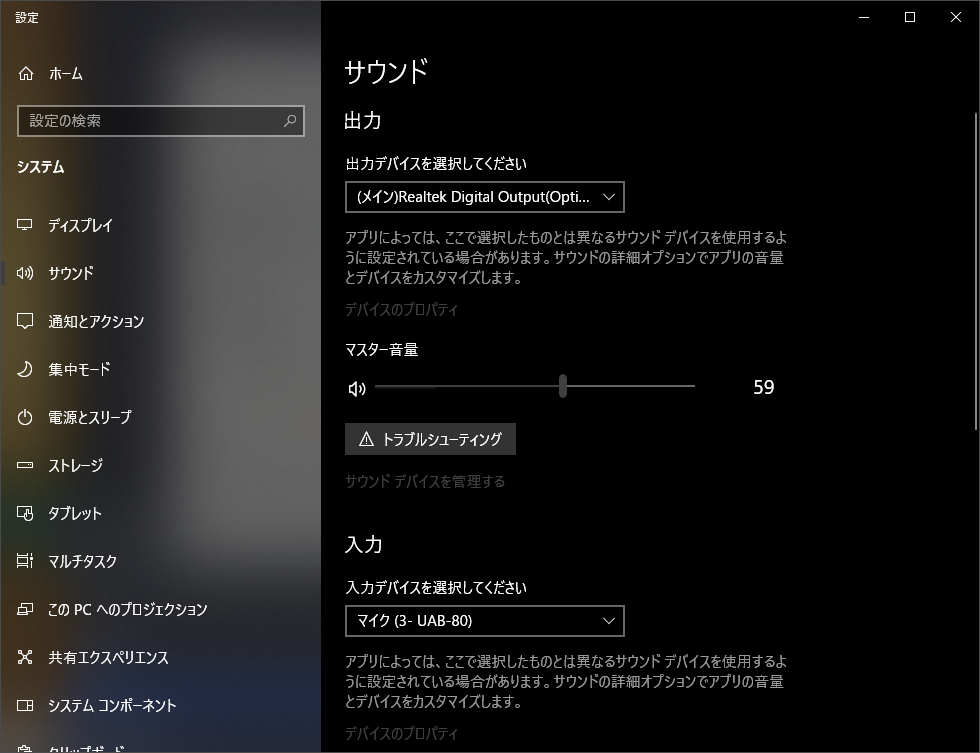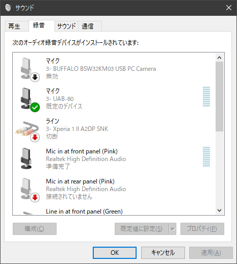Windowsの設定画面から行うか、サウンドの録音設定で確認出来ます。