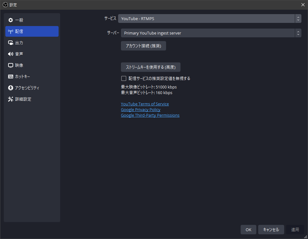 サービス[YouTube – TRMPS] 選択後に[アカウント接続(推奨)]を押下します。