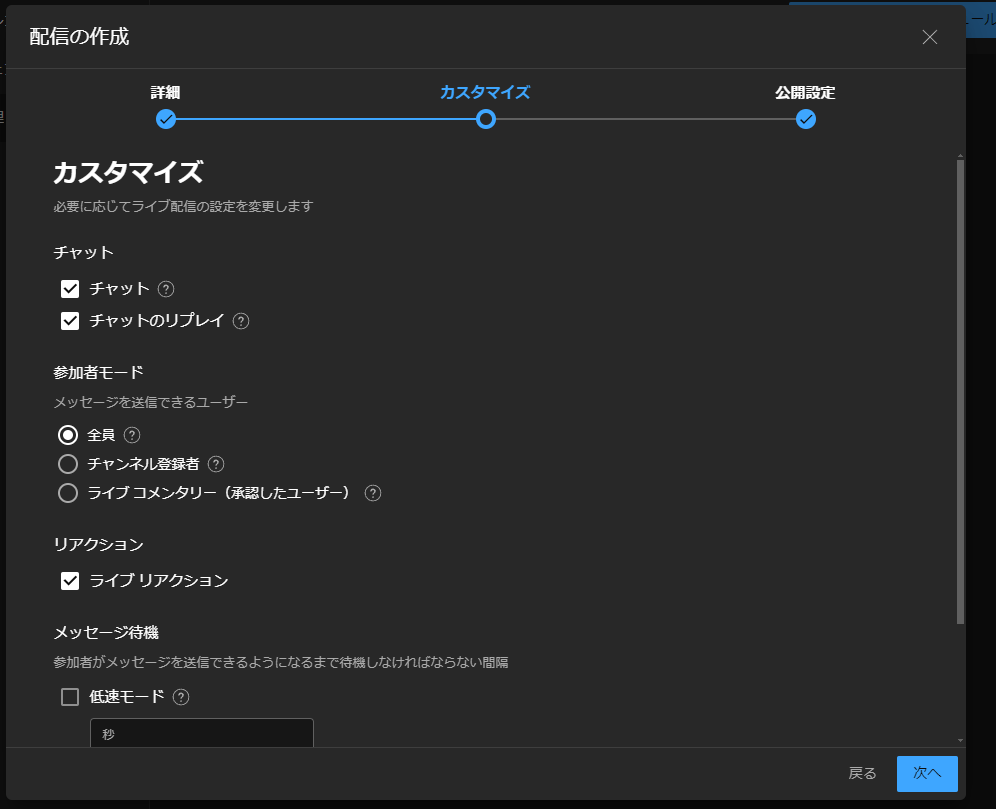参加者モードはメッセージを送信出来るユーザを限定出来ます。特定しない場合は全員で問題ないです。 他も随時設定変更してください。
