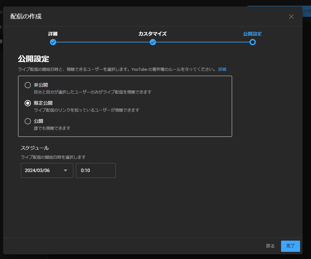 今回はテスト配信なので、[限定公開]または、[非公開]を選択します。