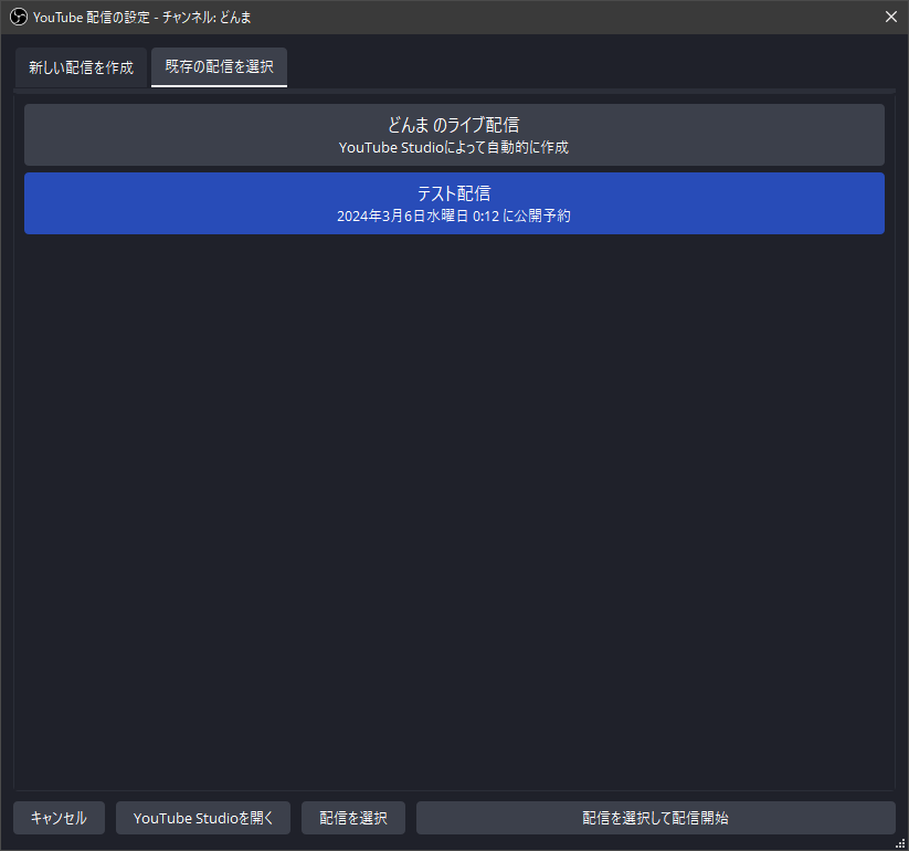 [既存の配信を選択]のタブを選択後YouTubeStudioで作成した配信予約を選択。