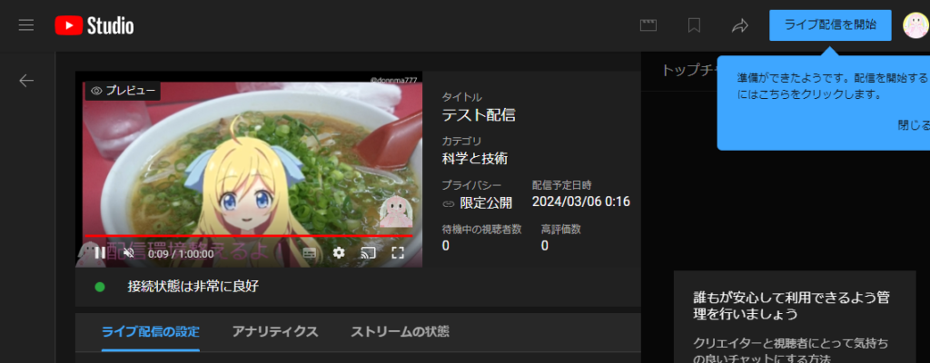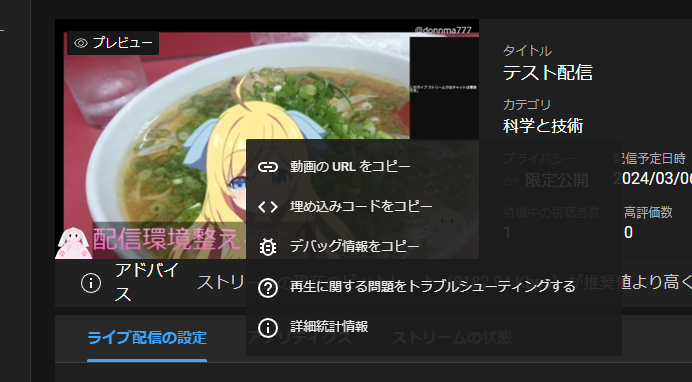 YouTubeStudioの動画画面で「右クリック→動画のURLをコピーしてブラウザの新規タブにペーストし、YouTubeの配信画面を表示」します。