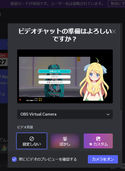 アプリケーションで[OBS Virtual Camera]が選択出来たら画面がキャプチャされています。