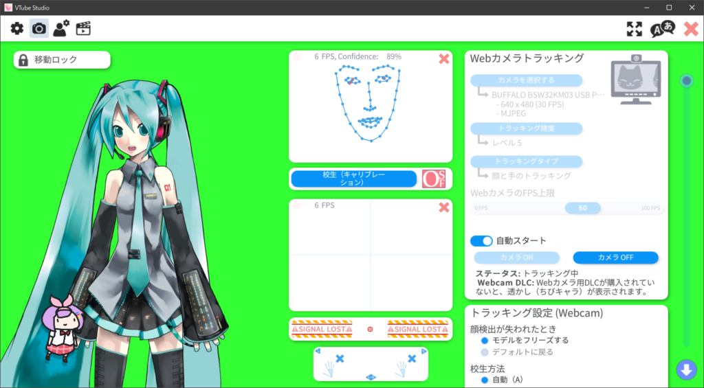 使用しているデバイスのカメラを選択後にカメラONにするとキャラクターがトラッキングされます。