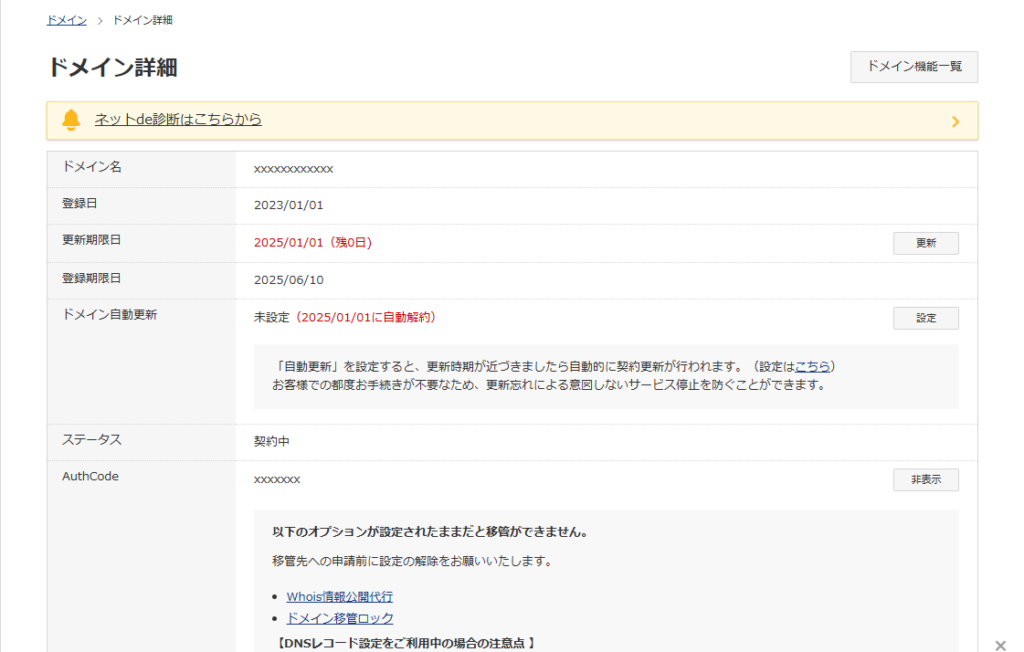ドメインの取得から60日以上経過しているか、または前回の移管から60日経っているかを確認します。これはレジストラのルールで決まっているため必須です。