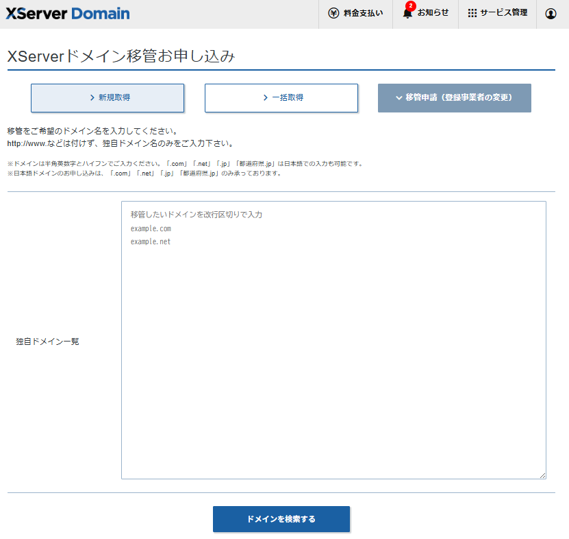 移管したいドメインを入力して「ドメインを検索する」を押下してください。