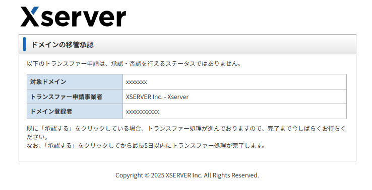 Xserverから「トランスファー申請に関するご案内」メールが来ているので、承認するを選択してください。