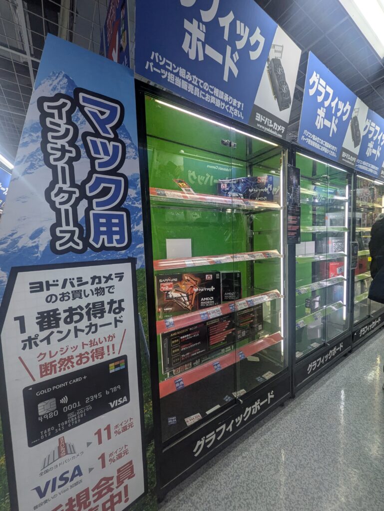 グラフィックボードはRTXシリーズがほとんど売られていない状況に・・・そもそも全体的に棚から商品が無かったです。