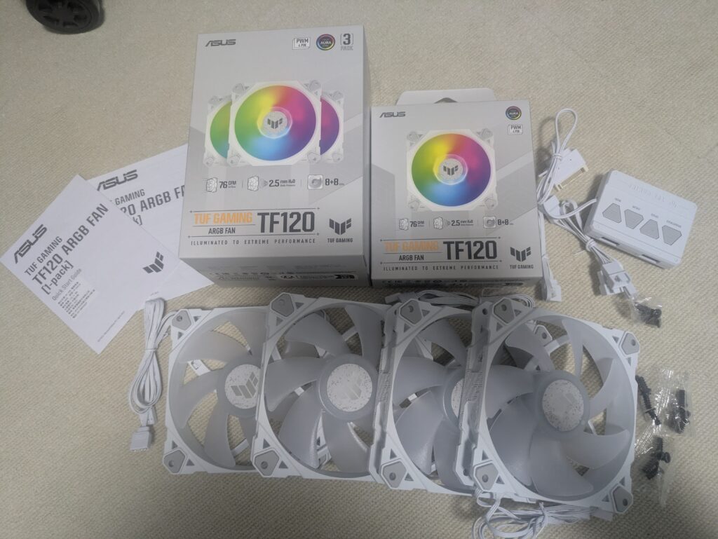 マザーボードと揃えてASUS製に。3IN1セットと単品1個で計4基搭載しました。