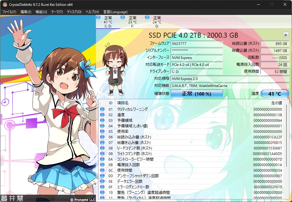 ランダムアクセス(RND4K)も優秀ですね。OSのキビキビとした動作に関わる一番下の数値も、Gen4のハイエンドモデルらしい高いスコアが出ています。