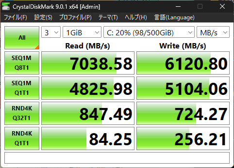 計測結果は概ねカタログ値より低いくらいです。これは、あの有名なハイエンドSSD「Samsung 990 Pro」や「WD_BLACK SN850X」に匹敵する、PCIe Gen4規格の限界値に近いスコアです。