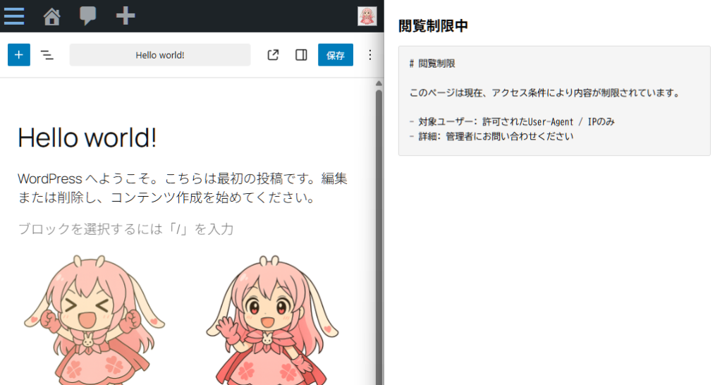 アクセス制限を行った場合は下記のようなイメージになります。(左側が編集画面・右側が実際に表示されるサイトイメージ)